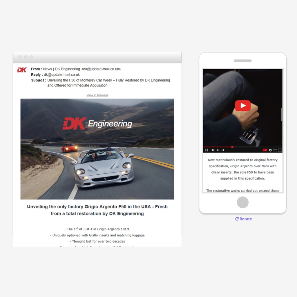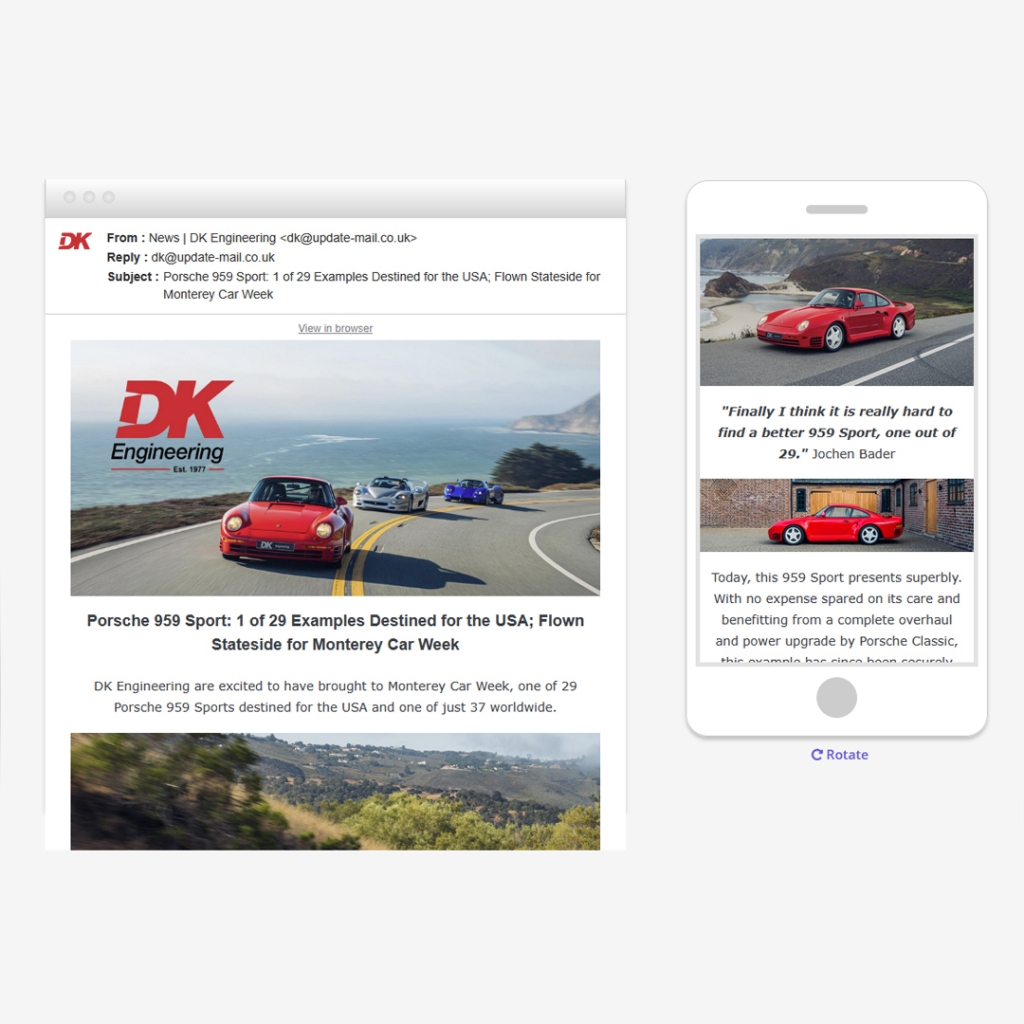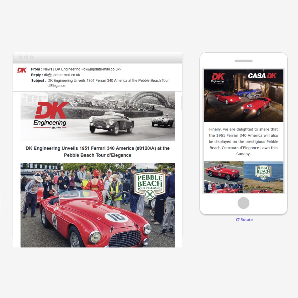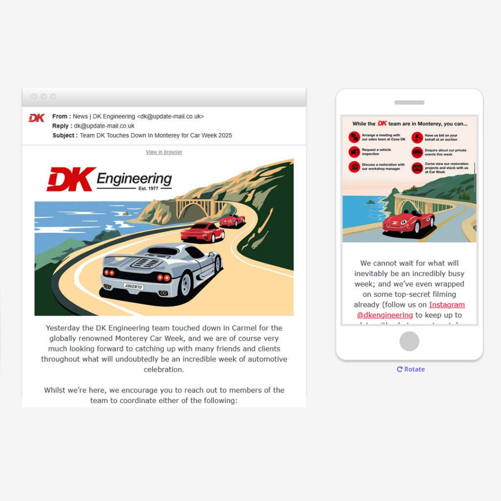 Over the past week, the DigitalFlare team has been proud to support DK Engineering with their newsletter campaigns during Monterey Car Week. With almost daily updates, engaging video content, and stunning photography, our goal was to keep DK’s audience fully up to date - whether they were viewing on a desktop, tablet, or mobile device.